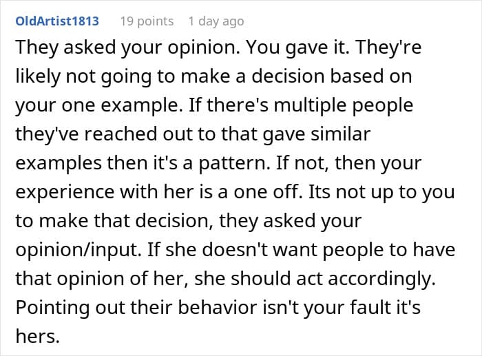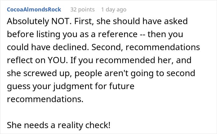 Thanks to her honest reference, the woman never got hired, but ended up accusing her of sabotage, so she turned to an online community to ask if being frank was a jerk move