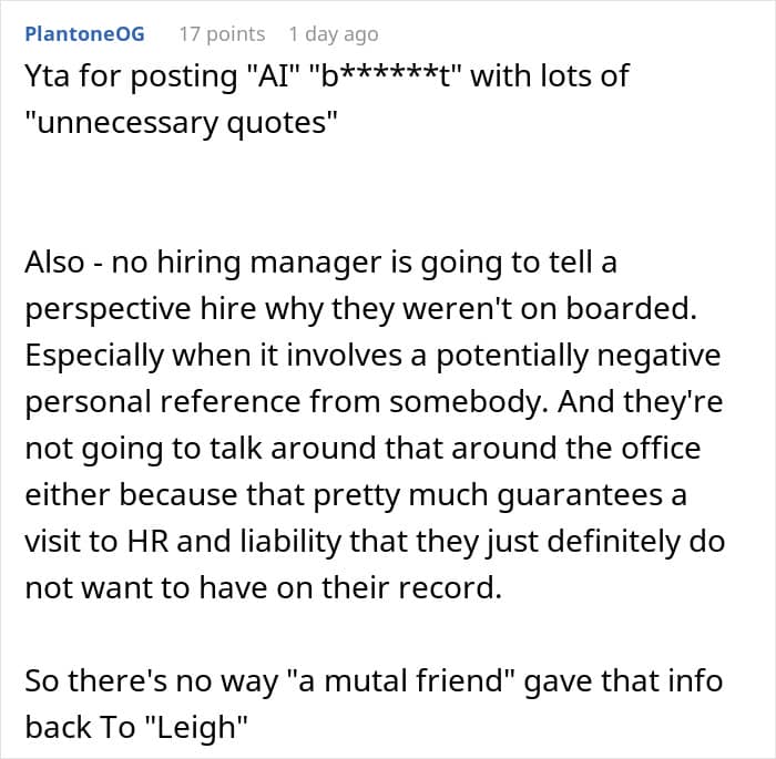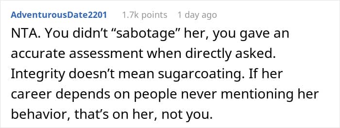 Now, their mutual friends are divided. Some say OP was fair for giving an honest reference, especially after Leah misrepresented her work. Others argue she should’ve been more diplomatic to avoid personal bias. But workplace integrity is tricky, and sometimes, being truthful is the most professional thing you can do.