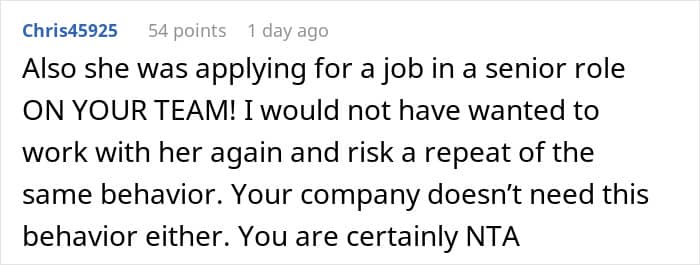 Months later, karma came calling with a professional twist. After moving to a new firm, OP discovered Leah had applied for a senior position on her team. When her creative director asked about Leah’s work ethic, she answered truthfully: Leah was talented but often exaggerated her role in group projects. No insults, just the facts.