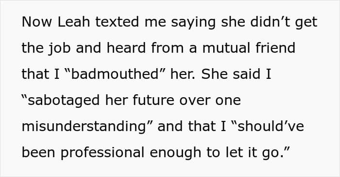 Soon after, Leah reached out, furious. She’d learned through friends why she hadn’t gotten the job and blamed OP for “sabotaging her future.” She even accused her of holding a grudge and being “unprofessional,” arguing that she should’ve let the past go instead of bringing up one “misunderstanding” from their agency days.