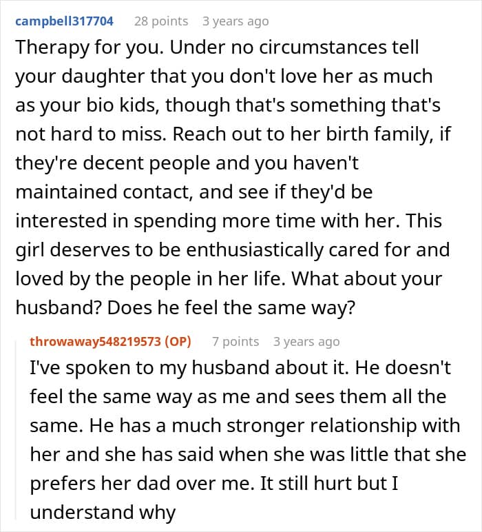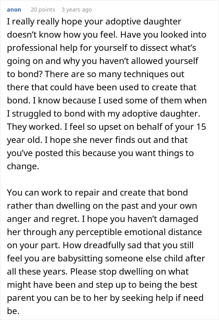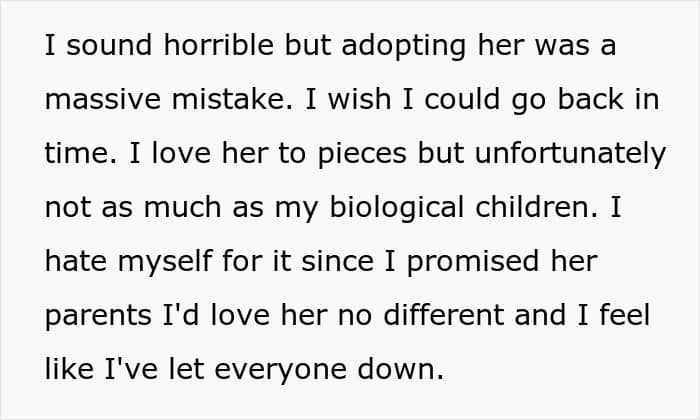 The OP explained that she feels very guilty about her true feelings. She pointed out that even though she loves her adoptive daughter “to pieces,” she still loves her biological children more.