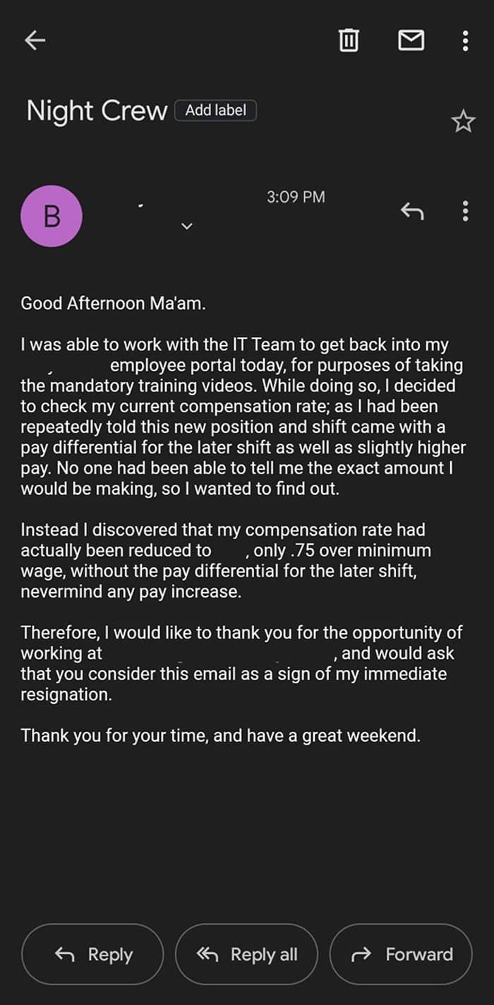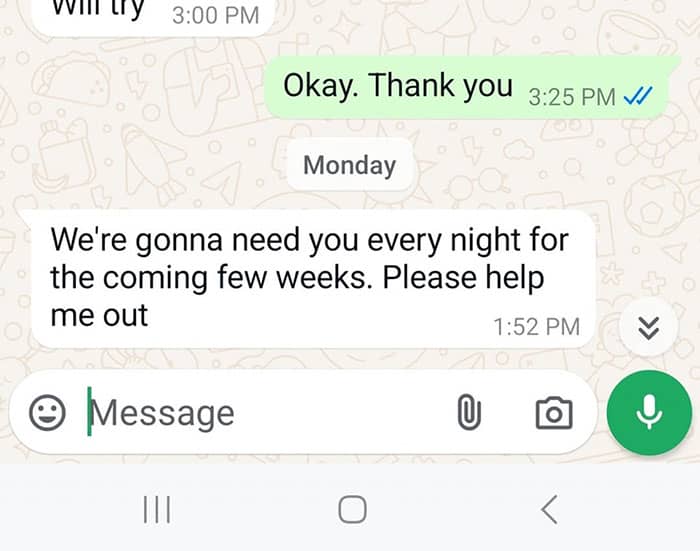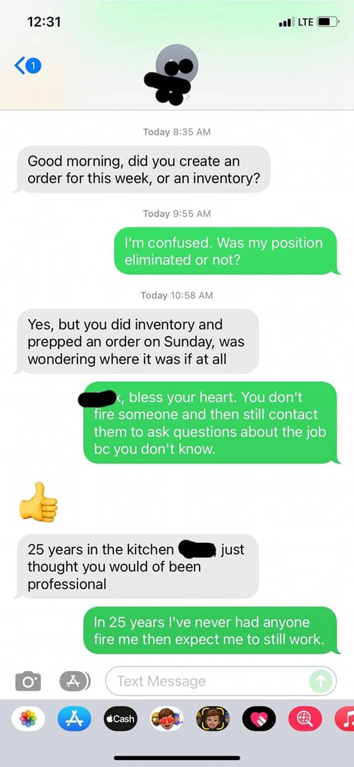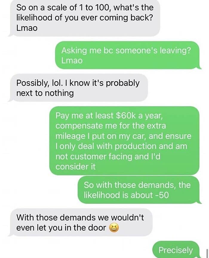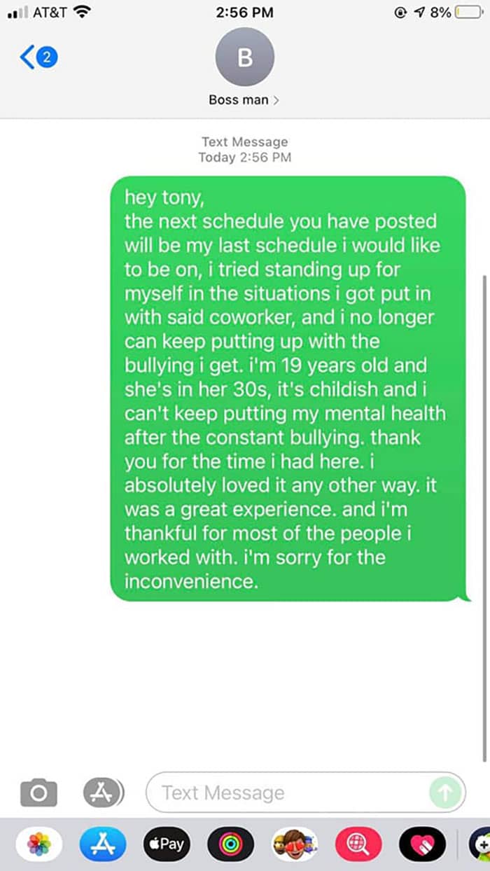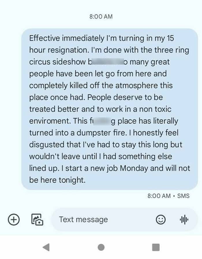 “Quit my job yesterday because I was tired of the unprofessional environment – got this text from my supervisor today.”