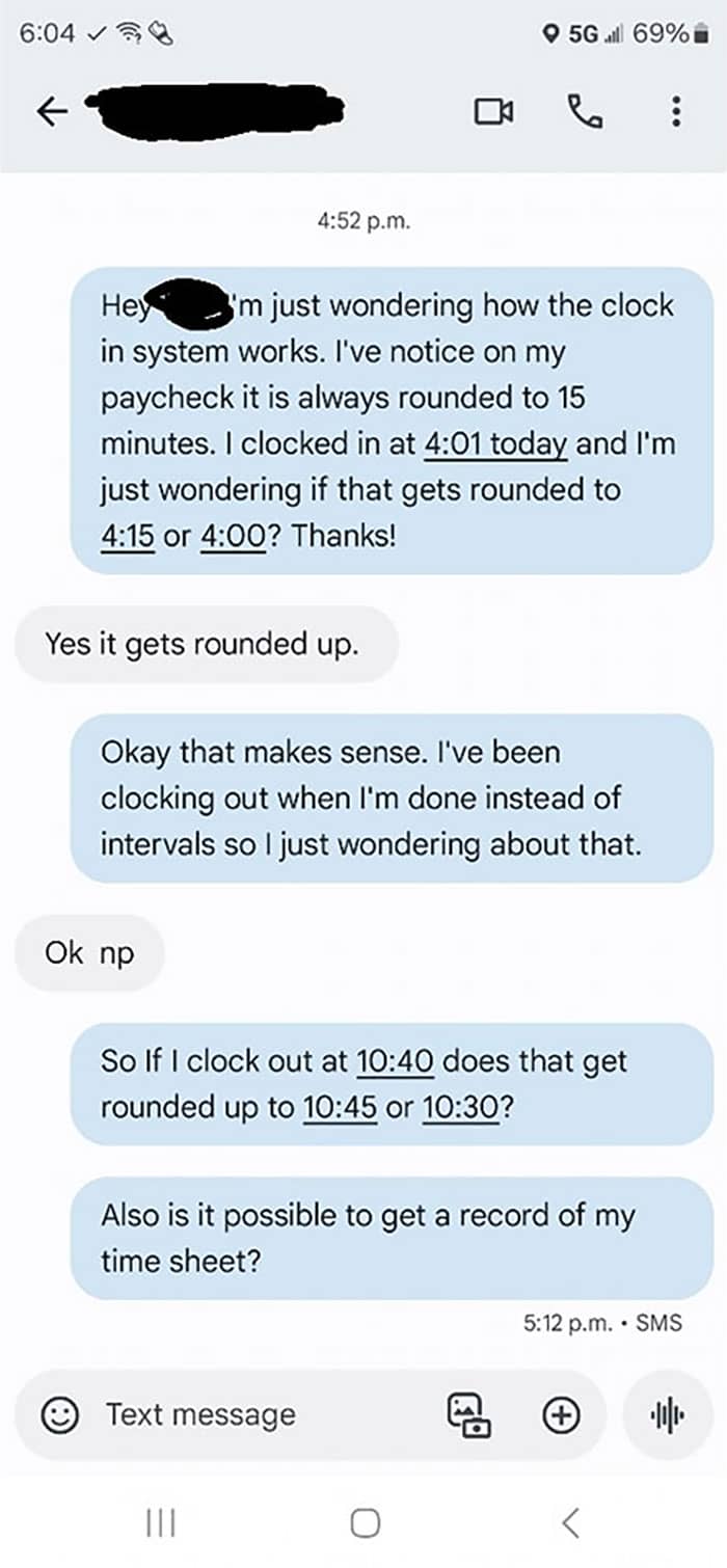 The time clock rounds my hours to 15-minute intervals. If I clock in at 4:01, I don’t start getting paid until 4:15. If I clock in at 3:50 and start working immediately as expected, I don’t get paid for those first 10 minutes. I know if I clock out at 10:40 it doesn’t round to 10:45. It gets rounded down to 10:30. My general manager confirmed that over text. This means I lose up to 28 minutes in my wages every shift.