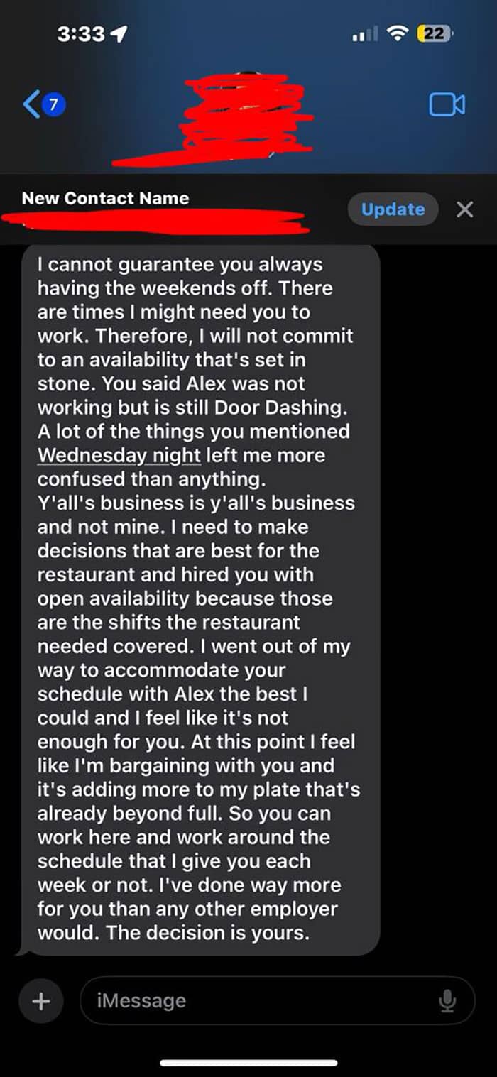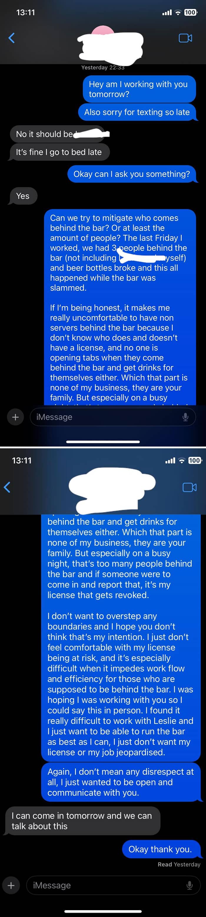 I should have let her fire me though. Turns out these OSHA fines can completely bury these franchise locations/small businesses. I called the owner following the texts to let him know I’m stepping away. Letting her fire me would have been the best way for them to realize how bad she is at her job.
