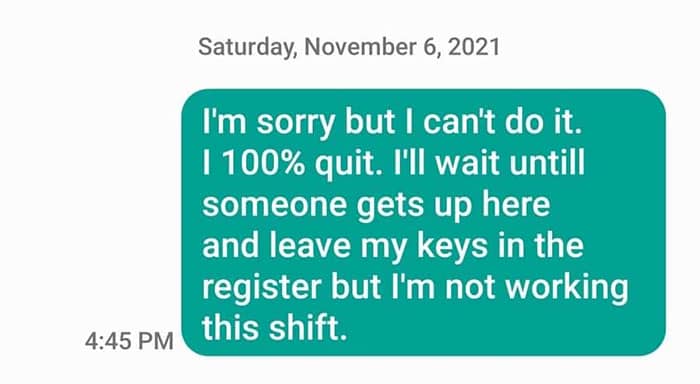 The Facebook page “I quit my job by text” has supplied us with many examples where people couldn’t be brave enough or bothered to hand in their notice in person. Even though it might not be the most professional way to do it, it can be a lifesaver for people who want to quickly get it over with, don’t care for the workplace anymore, or have extremely introverted tendencies, like the fear of confrontation.