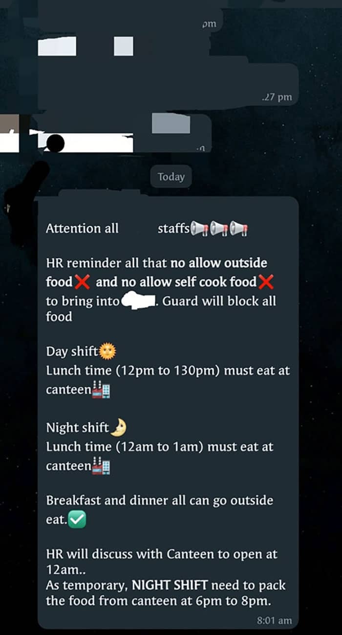 Today morning, my company HR announced staff not allowed to bring food in to company. Regardless of bought from shop or cooked from home. Company is indirectly or directly forcing us to buy and eat food from in house canteen. Why? I don’t know…but looks like want to the canteen profit to go up?? I bring my food from home as I am living with a budget. Is this legal and is there a way I can go about not following this rule