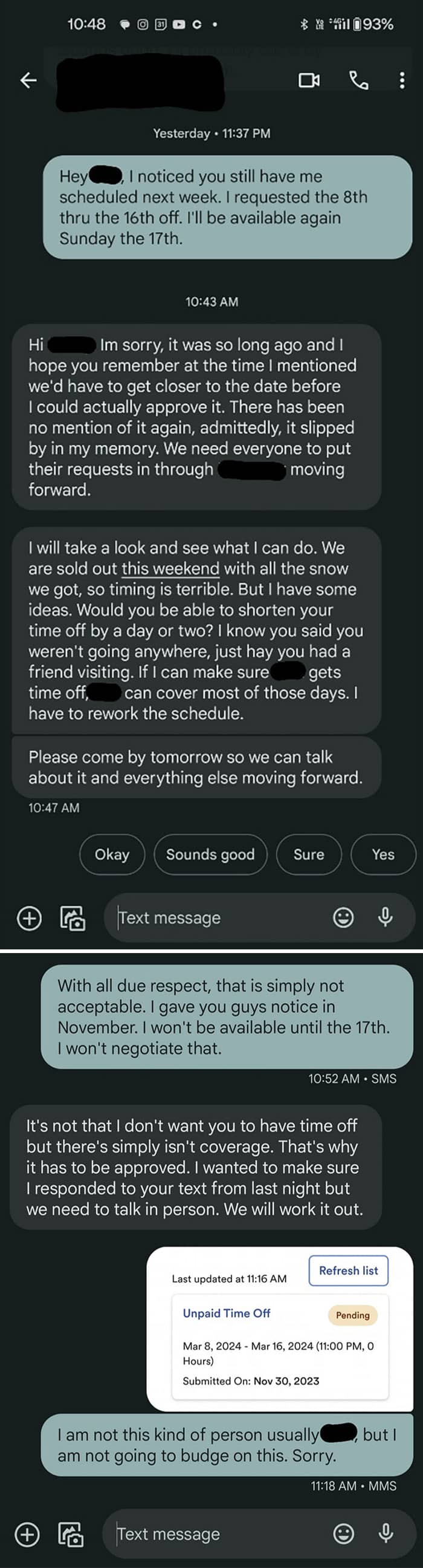 My dad had a stroke and I took my vacation at work to help care for him. He’s not doing too good, and my SO and I are moving to help him and my step mom, and I had to give a 1 week notice (not ideal, but better than none imo). Got this text from the owner of the store.