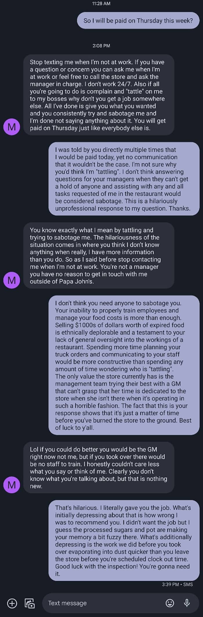 Changed our pay date without notice. Proceeded to claim it will be on the same 2 week interval next check. It wasn’t. This is the text exchange with the GM that followed. Turns out she didn’t like the owner and corporate supervisor knowing she’s been selling expired food.