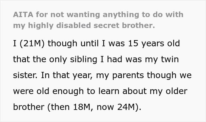 Today’s Original Poster (OP) didn’t just find out that he had an older brother he never knew, he also found out he had a neurocognitive disorder and was expected to take care of him in case something happened to their parents. However, when he refused, his twin sister’s accusations left him wondering if he was being unfair.