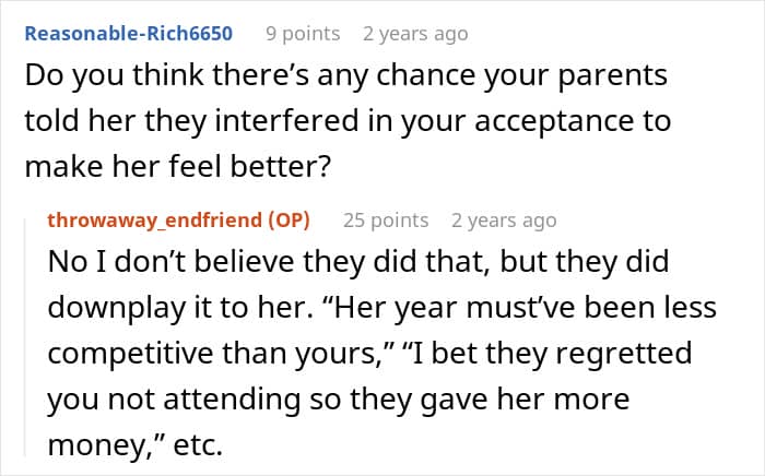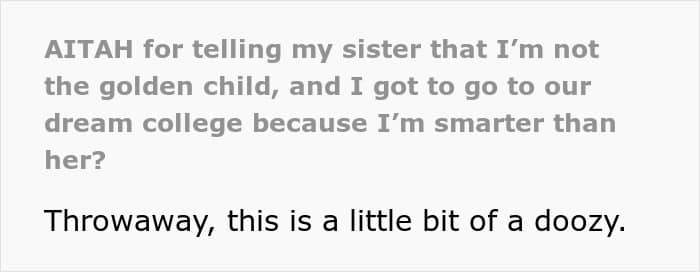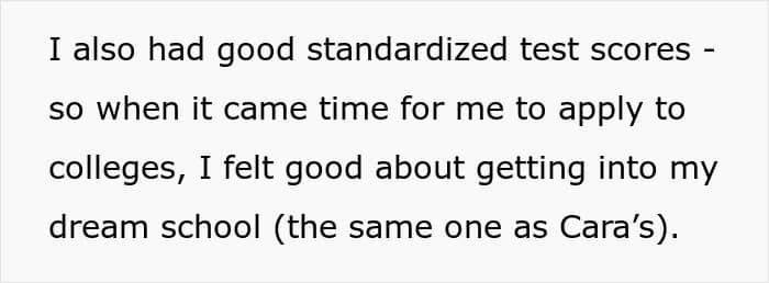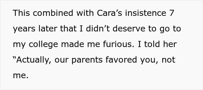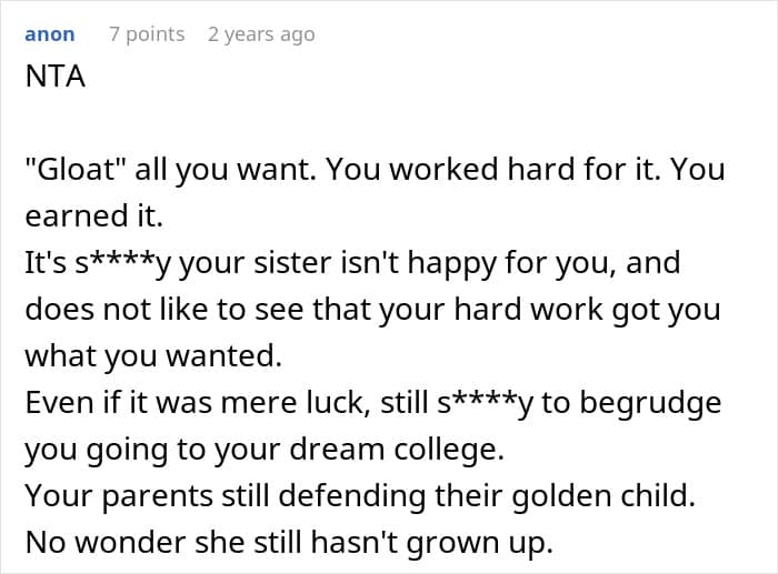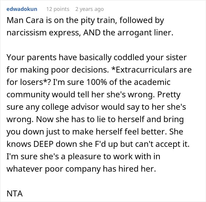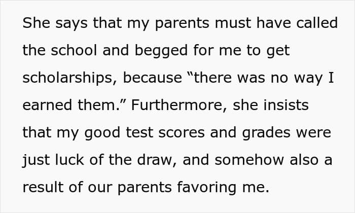 One woman thought good grades would be enough, but she was rejected. Her sister, in turn, had good test scores and did extracurriculars, and got into the same college on a scholarship. The woman held a grudge against her sister for years, but was put in her place when the sister had enough and pointed out how her entitlement came from being the golden child.