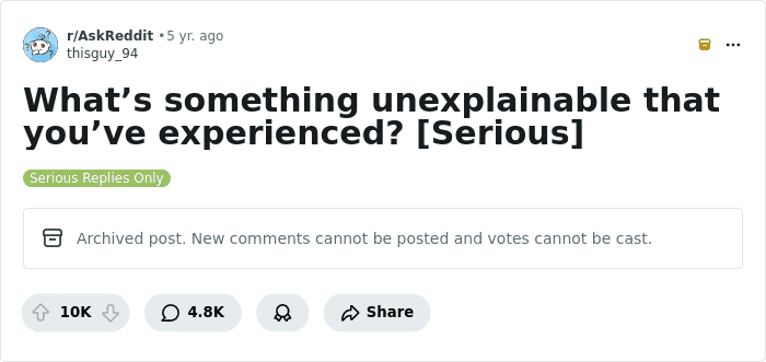 I find it particularly interesting because he is ex-military kind of no-nonsense. Doesn’t believe in god or ghosts or aliens. Isn’t superstitious in any way and was just kind of perplexed by the whole thing.
