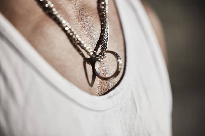 Then I felt something cold touch my stomach and the next thing I knew one of the rings had dropped onto the floor. I was confused at how it’d happened and thought maybe the chain had broken (even though it’s quite sturdy) and didn’t want to lose it, so I took my apron and gloves off and pulled the chain out of my shirt. The chain was intact and still clasped tightly together. And the other ring was still on it. So somehow, one ring had come cleanly off the chain without the other one falling off, and with the chain still clasped together.