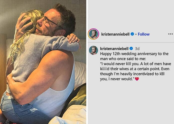 The 45-year-old actress wrote, “Happy 12th wedding anniversary to the man who once said to me: ‘”I would never ki** you. A lot of men have ki**ed their wives at a certain point. Even though I’m heavily incentivized to ki** you, I never would.”‘