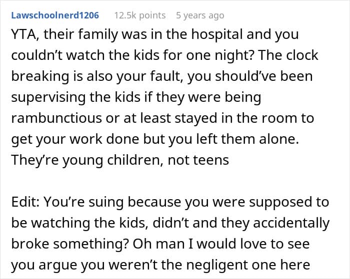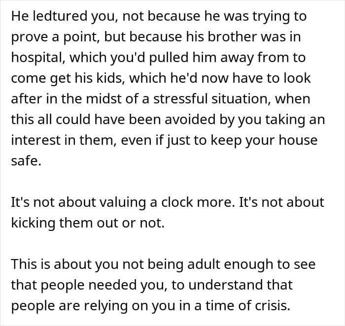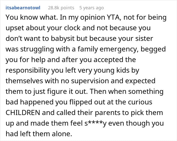 On the surface, the poster seems to have a point. They were coerced into babysitting against their will, set clear boundaries about not touching their belongings, and suffered real financial loss due to the children’s actions. The destroyed clock wasn’t just any decoration but a valuable antique, and children old enough to be in elementary school should understand not to handle other people’s precious items without permission.