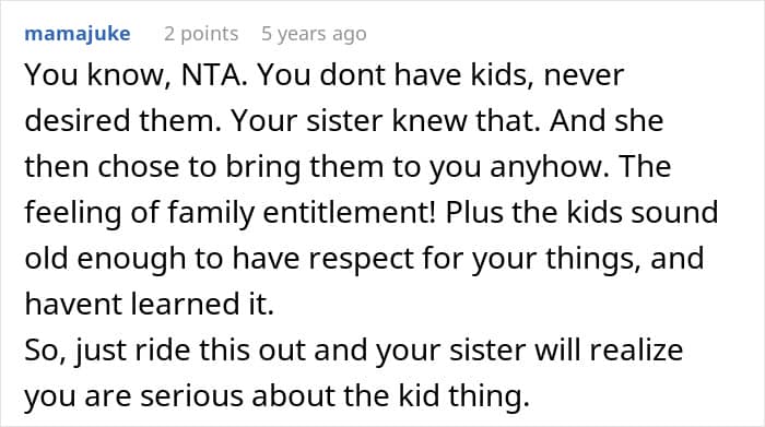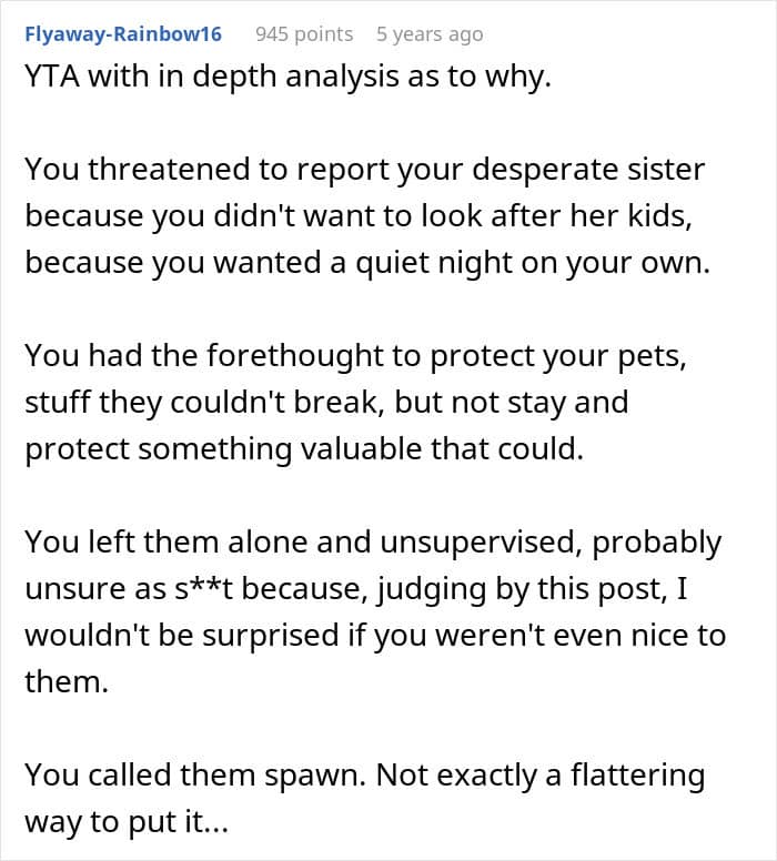 The discussion in the comments reflected a consensus that while the poster had every right to be upset about the damaged property, the complete lack of compassion, the failure to properly supervise children they agreed to watch, and their punitive attitude toward the financially struggling sister’s family made them the “jerk” in this scenario. Sometimes being technically right doesn’t make you morally right, and this appears to be one of those cases where standing on principle comes at the cost of basic human decency.