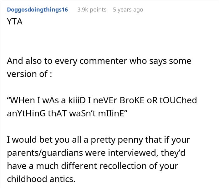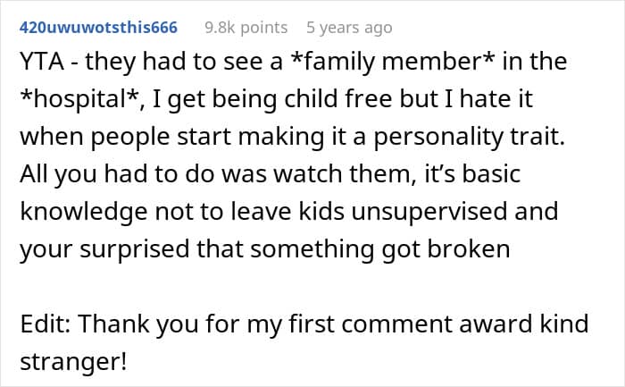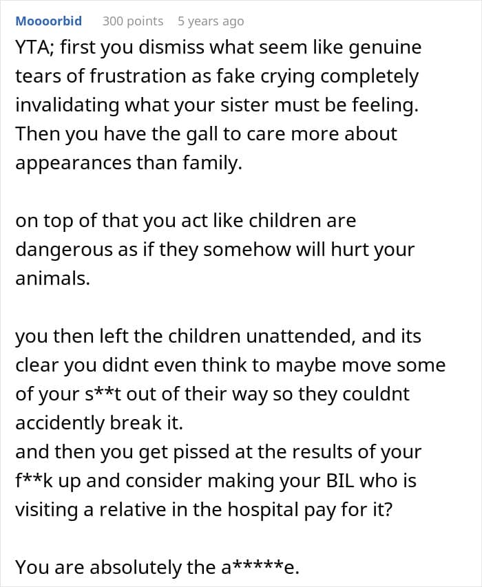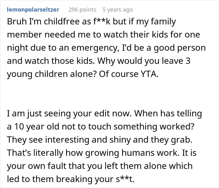 However, the online community largely sided against the poster, and it’s not difficult to see why. The tone throughout the post drips with contempt, referring to the children as “spawn” and displaying zero empathy for what was supposedly a family emergency. The poster isolated themselves in another room while leaving three young children essentially unsupervised in an unfamiliar environment filled with valuable, fragile items. Any parent or experienced caregiver knows that elementary-aged children, especially when left alone, will inevitably get curious and touch things they shouldn’t.
