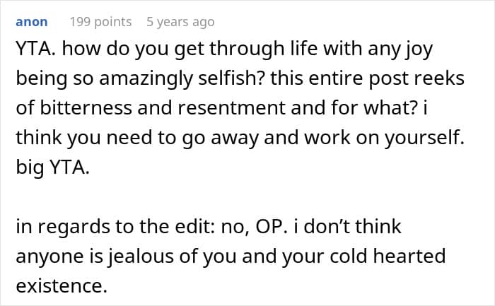 The later edits only made things worse. The poster revealed that their strained relationship with their sister stems from jealousy, real or imagined, over their success, illustrated by an anecdote where they posted vacation photos on Facebook while her sister’s family was experiencing serious financial hardship. The brother-in-law’s accident turned out to be a drunk driving incident, which they mentioned almost dismissively. Most damningly, they announced her intention to sue her struggling sister’s family over the clock, despite earlier claiming they couldn’t afford to pay anyway.