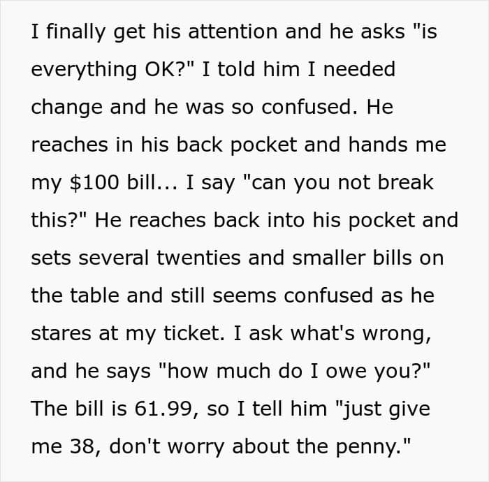 Well, we won’t be able to find out what exactly made the waiter struggle with the change. Maybe it really was a lack of math skills. Maybe it was even an attempt to pocket some extra money. But it’s also worth remembering that being a waiter can be an incredibly demanding job.