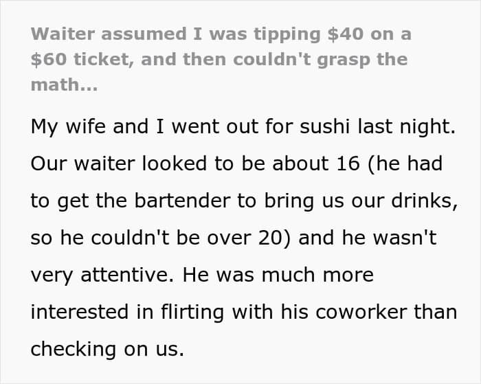 One Redditor recently found himself on the receiving end of one after paying a $60 bill with a $100. He soon realized the waiter wasn’t planning to bring any change back—and what followed was an awkward, almost comical exchange that had people divided over whether it was an honest mistake or something else entirely. Read the full story below.