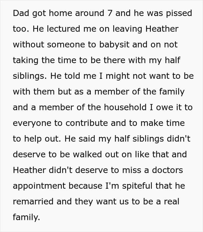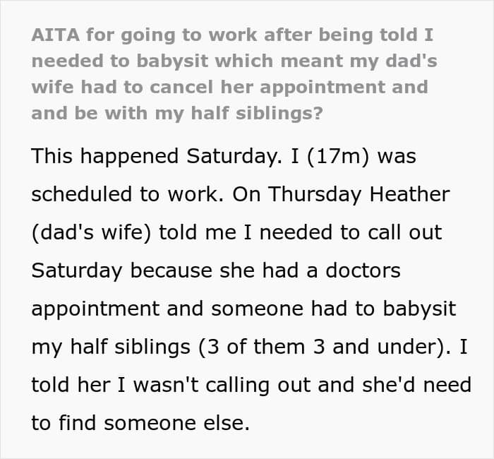 The poster had work on Saturday, yet he was expected to look after his 3 half siblings, as his dad’s wife (Heather) had an appointment