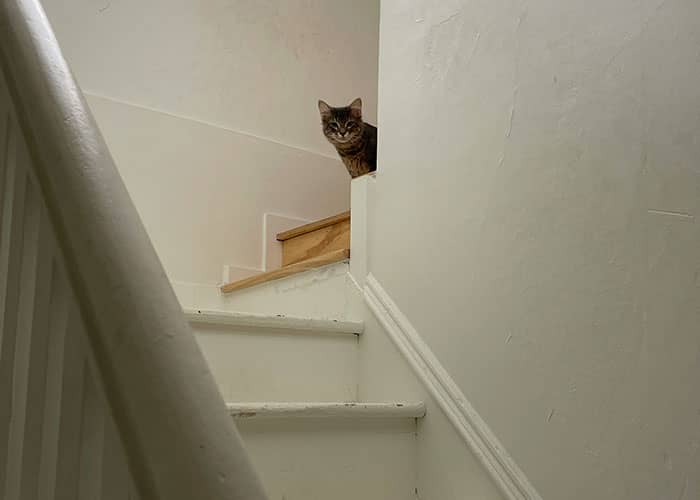The cat got wound up in his legs and he tripped, taking a header right down the stairs. There were about 16 steps and at the bottom, a concrete platform.