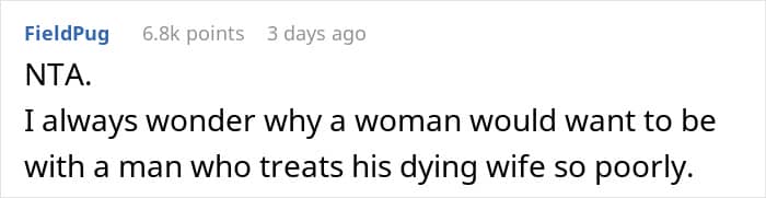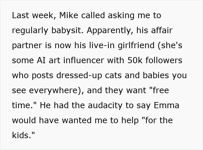 Like this guy, who was unfaithful to his wife during her chemo treatment. Her best friend took care of her during that hard time instead, and grew to loathe the husband. So, when he became a widower and asked her to babysit the kids so he can have more free time with his girlfriend, the woman blatantly refused.