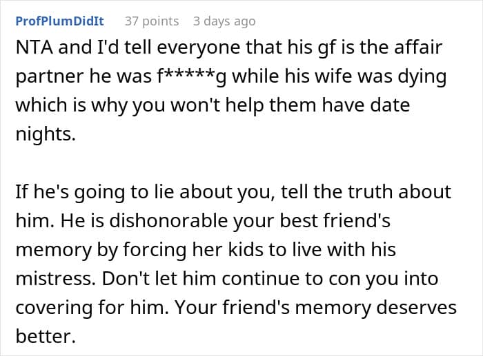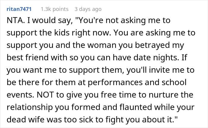 RELATED:A widower asked his deceased wife’s BFF to babysit his kids so that he and his new GF could have more “free time”