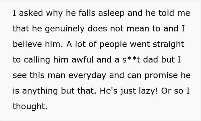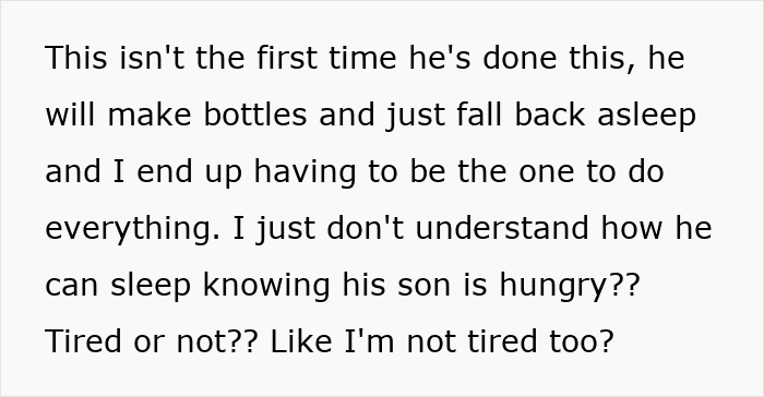 She explained that he sometimes wakes the baby, hands him over, and then falls back asleep while the bottle warms. OP says she has no idea how he just falls asleep while his own child is hungry. Despite clear communication and multiple talks, he kept slipping up, and she was running on fumes from constant caregiving.