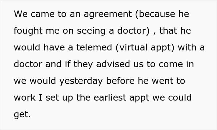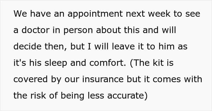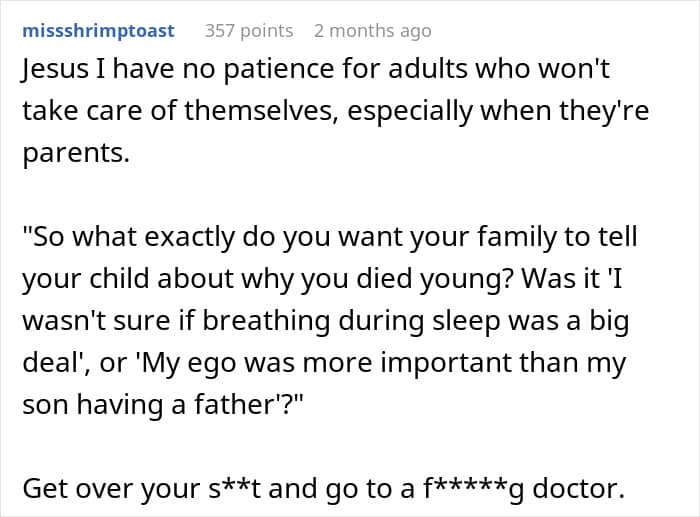 Let’s hope OP’s husband can get himself checked out and treated sooner rather than later. After all, he needs to be pulling his weight during those brutal nighttime shifts, too. What would you do if you found yourself in OP’s shoes? Share your thoughts in the comments!