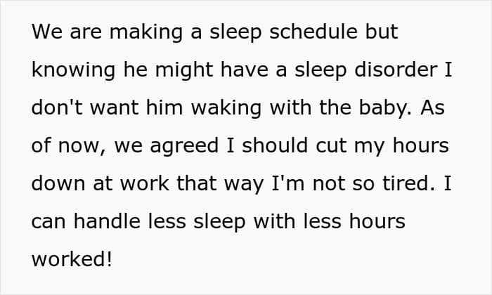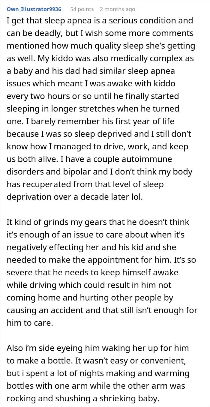 For now, the couple has agreed to reduce her work hours and adjust their nighttime routine until he gets treatment. OP’s still frustrated, but relieved to finally have answers. What started as a fight about baby bottles turned into something far bigger, and possibly lifesaving. Definitely relationship-saving, by the sounds of it.