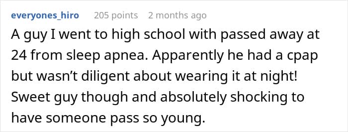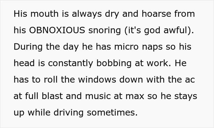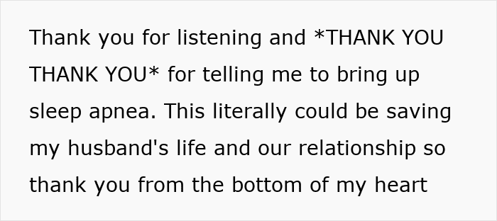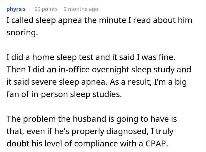 After one particularly rough night, OP confronted him again. When she asked about his sleep habits, he sheepishly confessed to gasping for air, waking up drenched in sweat, taking “micro naps” at work, and struggling to stay awake while driving. OP’s readers suggested he might have sleep apnea.