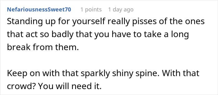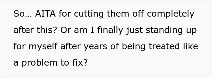 Third, there’s a performative aspect to family “support” that prioritizes appearance over actual care. The fake adoption party wasn’t really about the poster or her needs at all. It was about the family’s desire to feel helpful, to celebrate, to be seen as supportive relatives. They wanted the emotional payoff of “fixing” her problem without doing the harder work of actually listening to what she needed. Their elaborate gesture was fundamentally selfish, designed to make themselves feel good rather than to genuinely support her. Many families operate on unhealthy dynamics of enmeshment, where individual boundaries are seen as rejection or betrayal. When the poster established firm boundaries by cutting contact, the family immediately framed it as her breaking the family apart rather than acknowledging their role in creating an intolerable situation. This refusal to accept accountability is characteristic of families that prioritize unity over individual wellbeing.