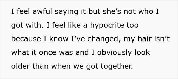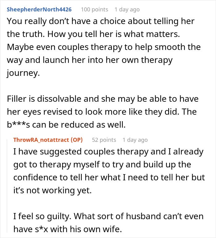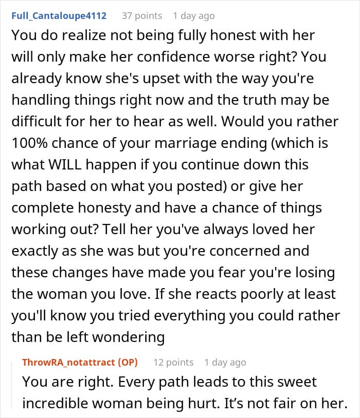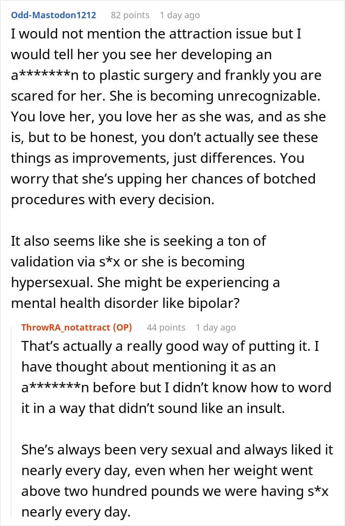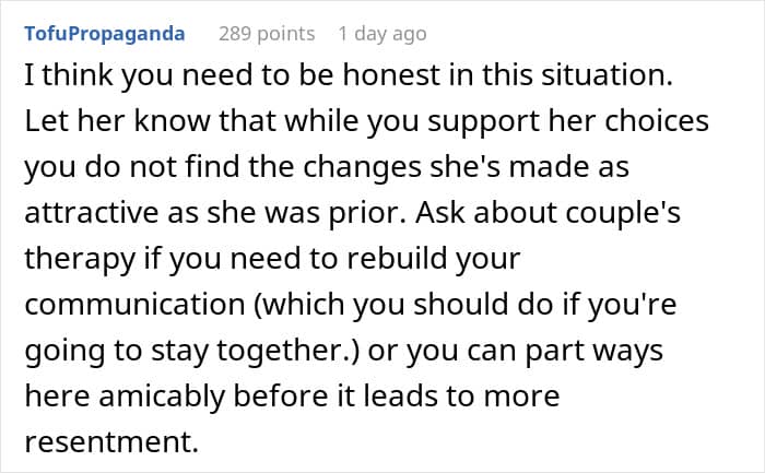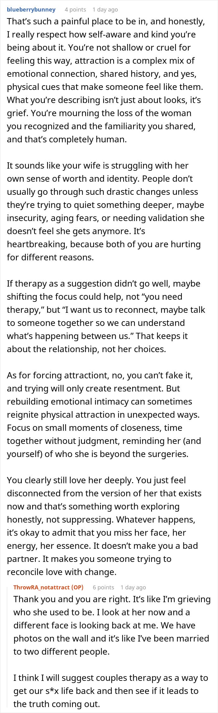 Even though the man had asked his wife several times why she felt like she needed to alter her appearance this much, she mentioned that it made her feel much more content. That’s why he also felt stuck and didn’t want to broach his loss of attraction, because he knew it would probably dampen her joy.