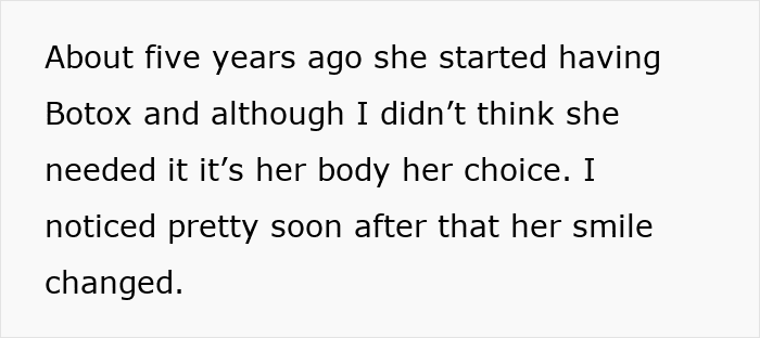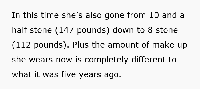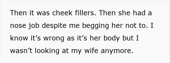 Within five years, the poster’s wife got botox, lip fillers, a nose job, cheek fillers, and chest augmentation surgery all of which completely changed her look