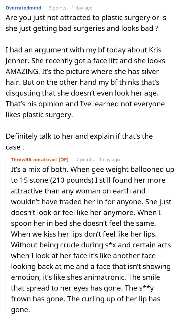 After two decades of being together, the OP started getting concerned because he wasn’t as attracted to his wife anymore. The reason for this wasn’t her age or natural physical changes, but the fact that she had undergone multiple cosmetic procedures that had drastically altered her look.