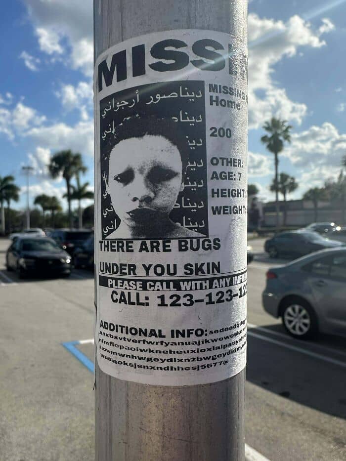 I found this missing person’s at a parking lot at Best Buy. I thought it was another normal missing persons flyer, but until I took a closer look I noticed the weird picture the description and the additional info. Is this some promotion for like a movie or an ARG?