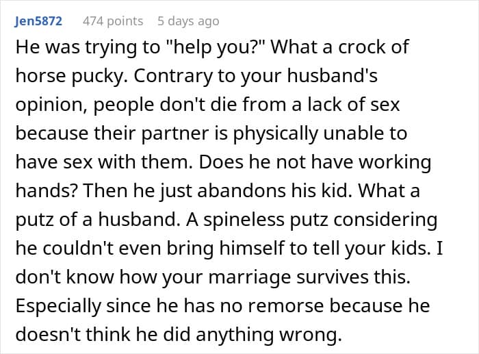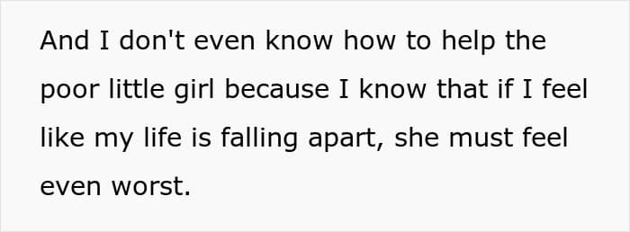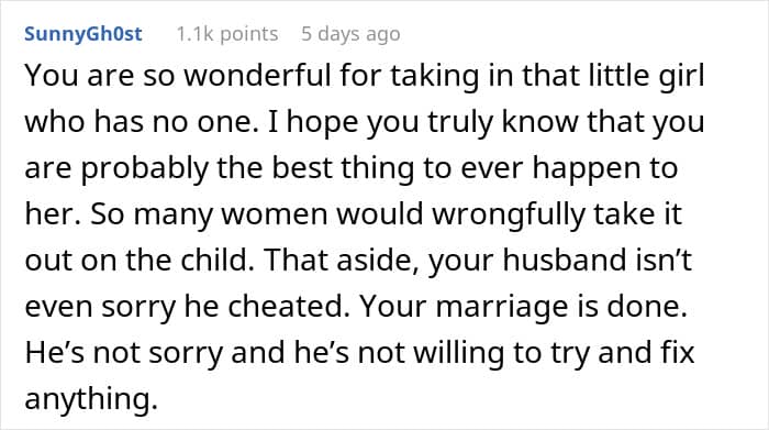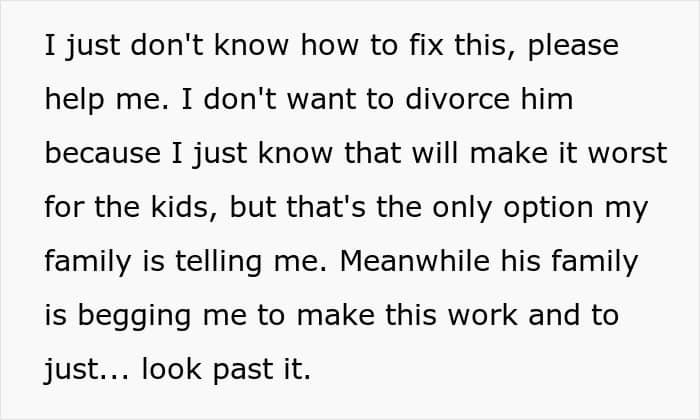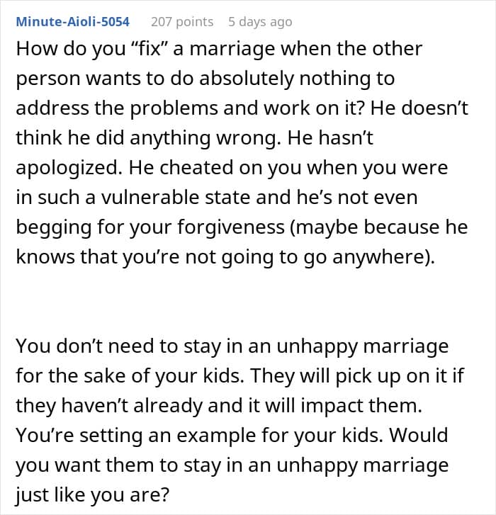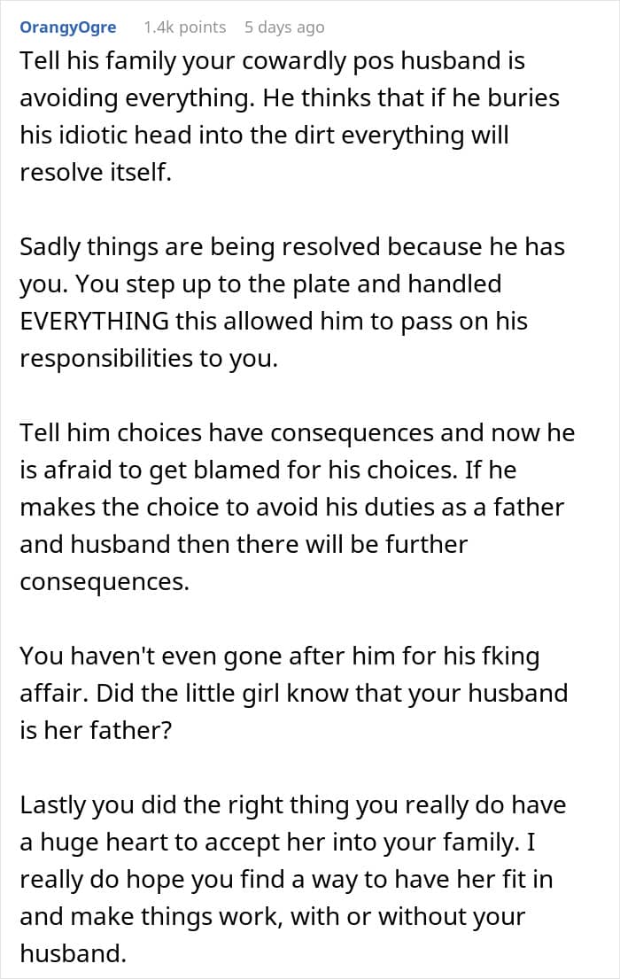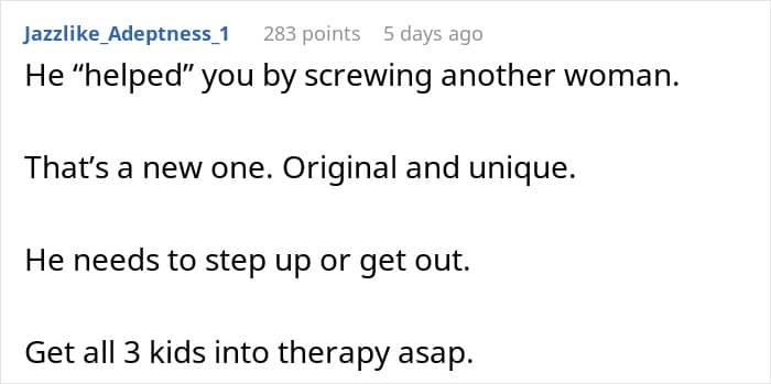 Community members shared a few different solutions: “OP, I’m sorry this is happening. It’s not fair to you or your children or this little girl. But please stop doing his emotional labor, stop fixing his mistakes, stop covering for him,” one user wrote. “Tell your husband to pull his finger out, stop acting like a fucking victim or you will leave. Honey, personally, I’d leave anyway,” another added.