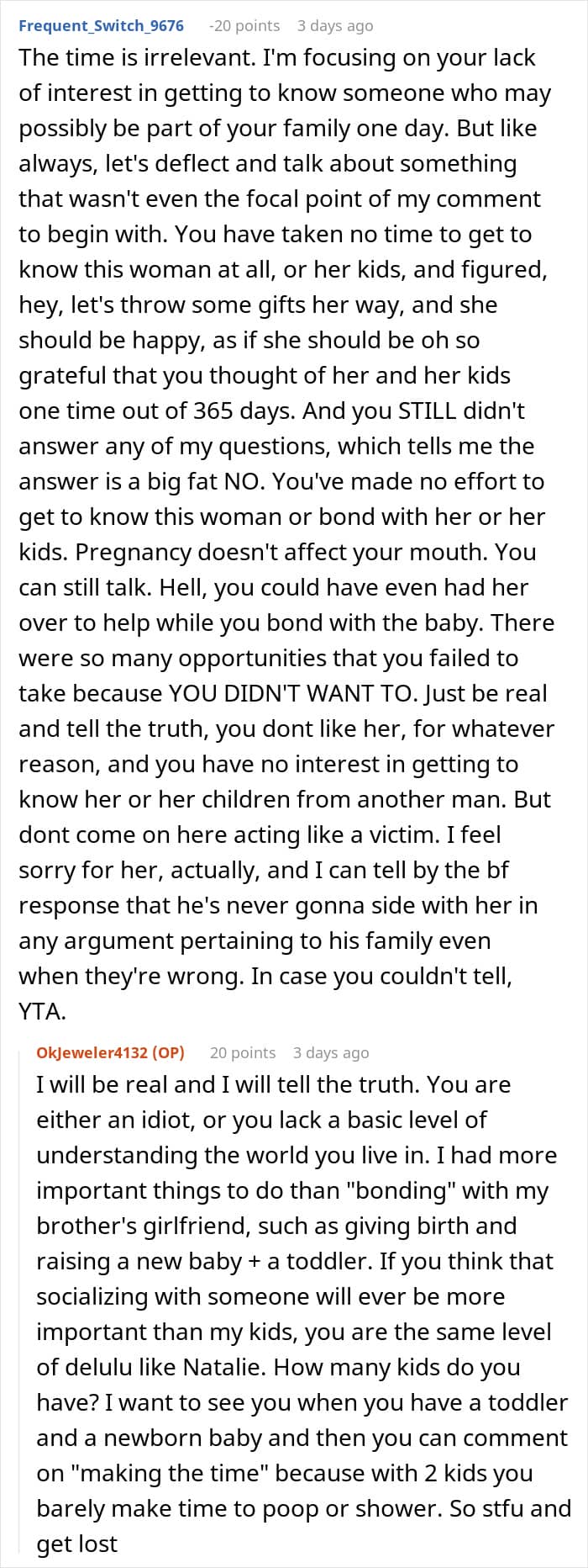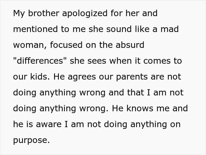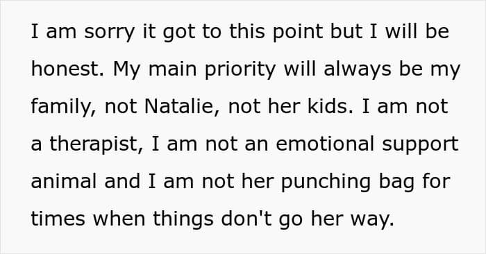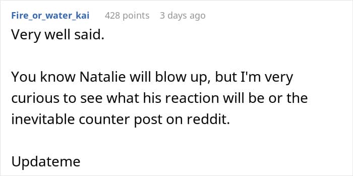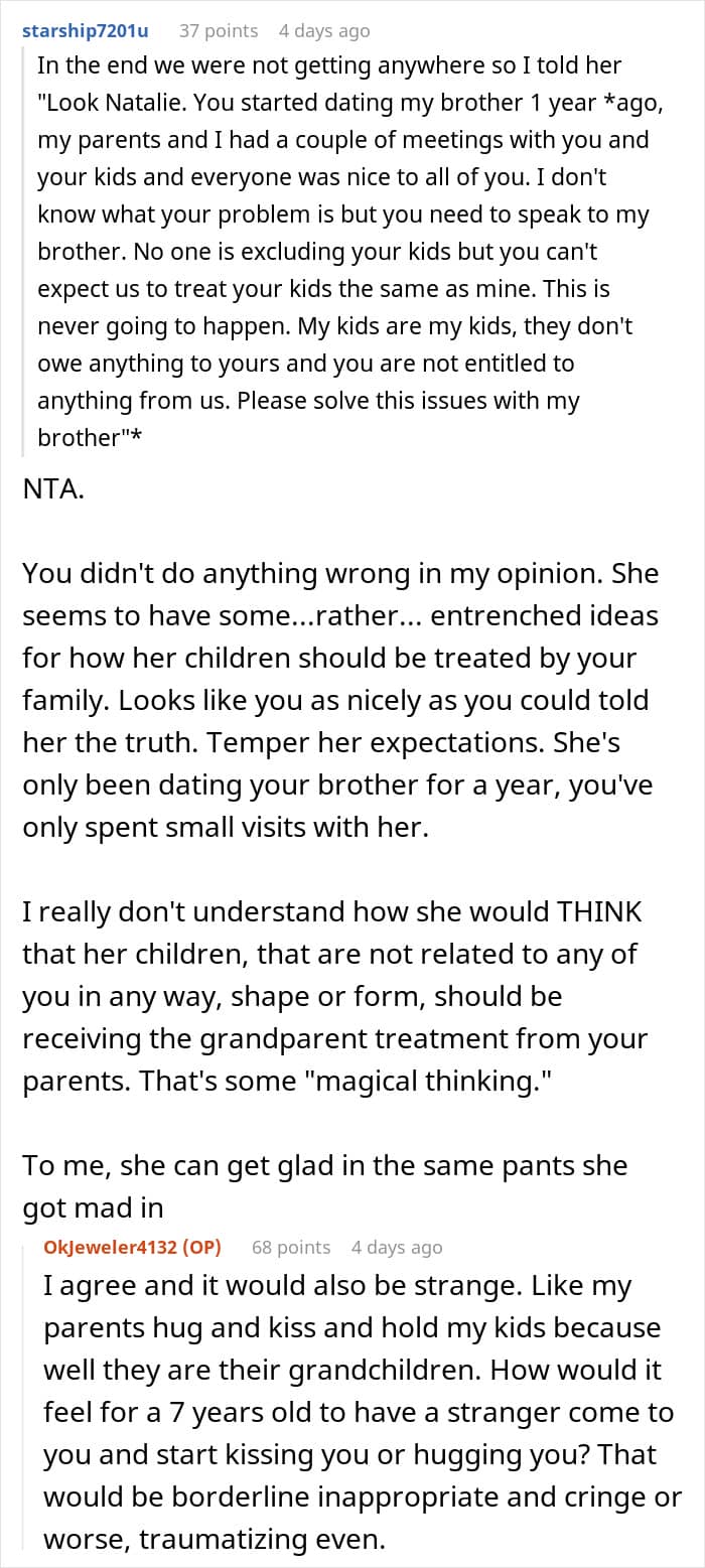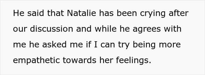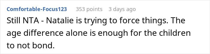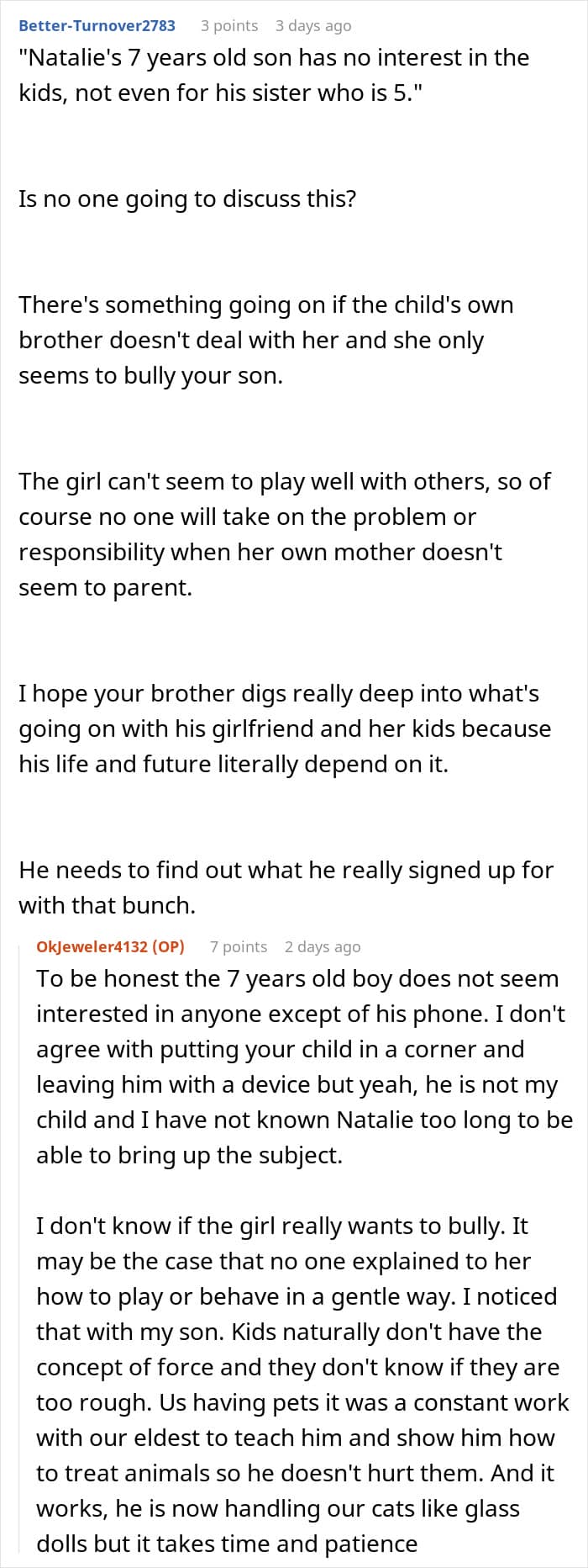 Natalie can explain the differences, but it’s not entirely fair to assume a child will be able to understand exactly why this is happening. Familial relationships are complicated. Natalie has been dating the woman’s brother for a year, maybe not a long time as far as families go, but a very, very long time for a child. Many of the readers seem to have overlooked this, something all too common in these sorts of stories. Naturally, we tend to side with the person telling the story, as we see their perspective. This doesn’t mean that the woman who made the post is wrong, but it’s simply something to keep in mind.