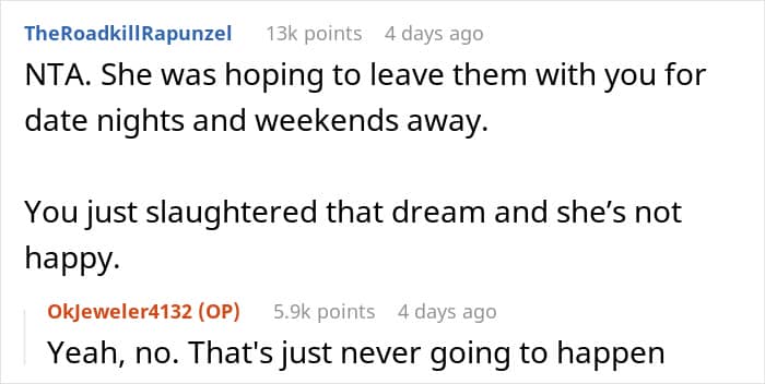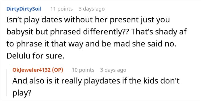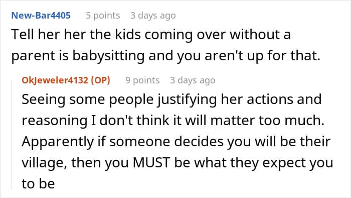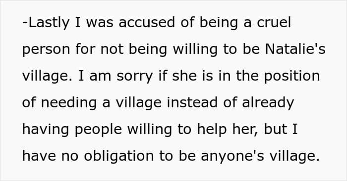 This is a two-way road. There is a lot of speculation about Natalie’s motivations here, that she just wants free babysitting, but this isn’t immediately clear. Certainly, she doesn’t seem to take being told “no” very well, although she also doesn’t seem to see the author’s point of view either. It seems like a case where some honest and frank communication is needed to sort out these clearly misaligned beliefs.