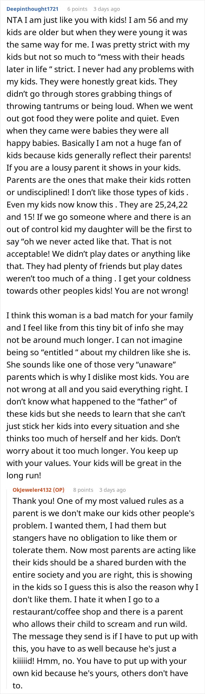New partners might be quick to try and capitalize on this, as many of the comments suggest. One reason this story was a bit divisive (you can find a variety of opinions in the comments below) was that Natalie isn’t wrong that it’s good for kids to hang out. Similarly, children are very, very sensitive to injustice, at least as far as they perceive it. They might have asked their mom why these new adults didn’t treat them the same as the “other kids”.
