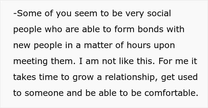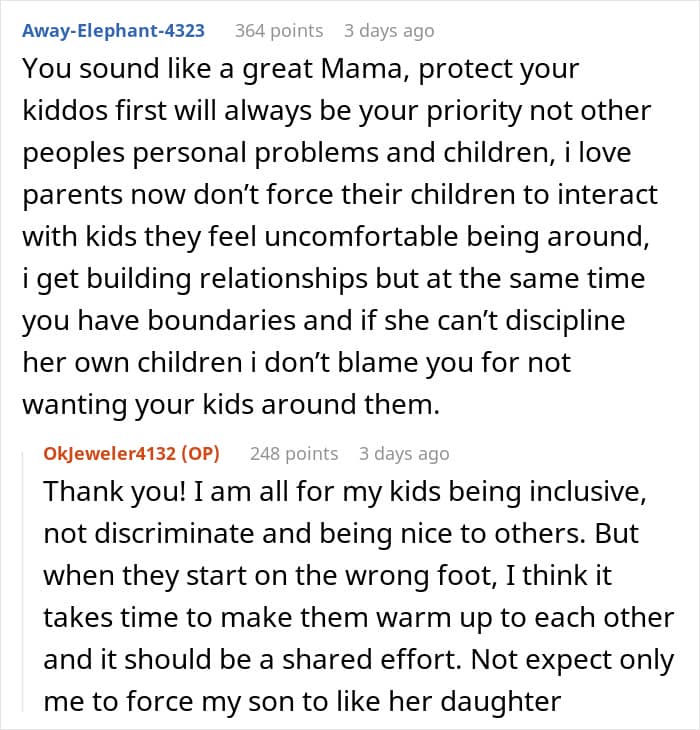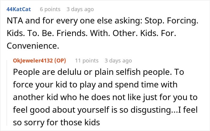 As this story demonstrates, this dynamic becomes especially complicated when children are introduced. It’s good for kids to socialize, have friends and for the parents to potentially have someone nearby they can trust. But at the same time, as this woman suggests, the demands become unreasonable. Not all kids get along, as many parents learn when they try to force friendships. They’re not being snooty or standoffish, they’re just trying to set healthy boundaries in a scenario that’s moving faster than they’re prepared for.