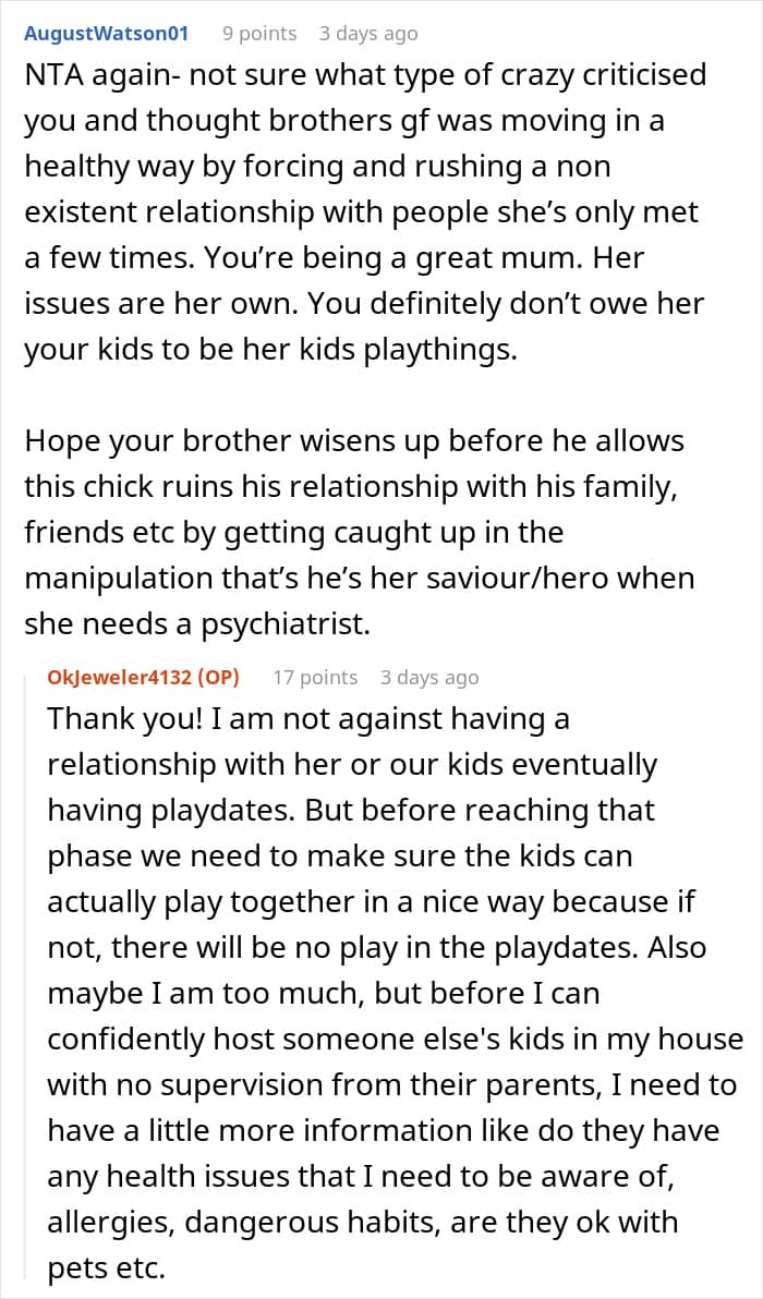 A woman asked the internet if she was wrong to turn down her brother’s girlfriend’s request to have their kids interact more when she felt it wasn’t a good idea. Later, she shared an update. We reached out to the woman who made the post via private message and will update the article when she gets back to us.
