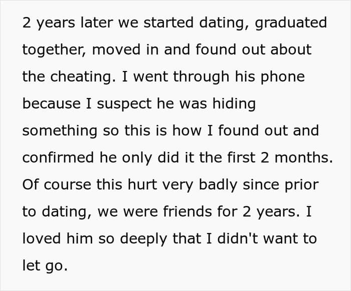 Yes, you read that right. They had known each other since she was 18 and he was 19, when they were in college. They became really good friends, and two years later, they started dating. Sadly, just two months into their relationship, he cheated on her with multiple women, even with his ex, and also used Tinder. She only found out about it a year later, when she moved in with him.