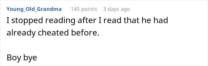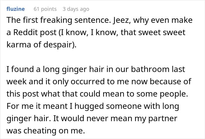 Things seemed to be fine after a lot of individual and couples therapy, but then the hair incident happened, and she vented online. OP gave an update on the next day that he had indeed been cheating on her, so she left immediately. The poor woman loved and cared for him a lot, which is why she had given him another chance in the first place, but he broke her trust all over again.