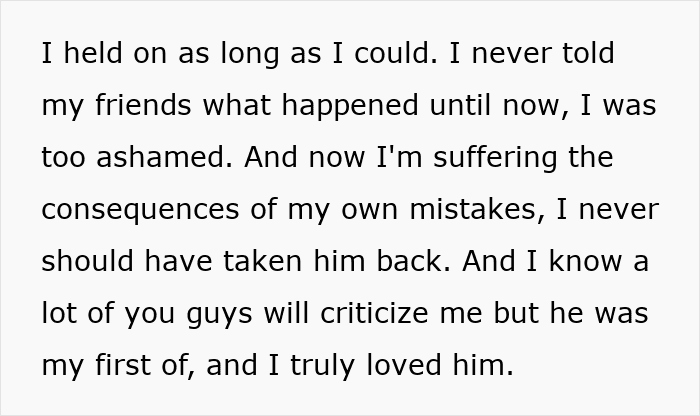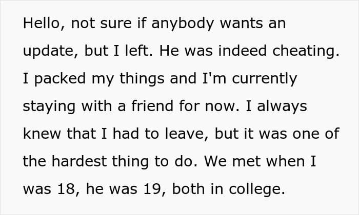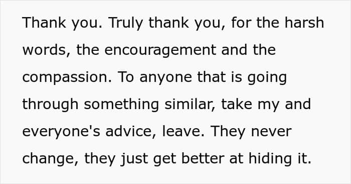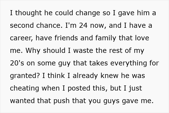 Currently, she is staying with a friend while figuring things out. The poster never told the truth to her friends as she was so ashamed, but now, she realized that she didn’t deserve this. After all, she is only 24 years old, has a good career, people who care about her, and her whole life ahead. There’s no point wasting it on someone who doesn’t even value her.