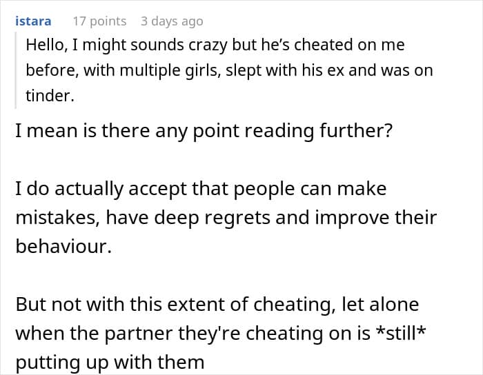 Netizens were aghast at how flimsy their relationship sounded, and many claimed that “once a cheater, always a cheater”