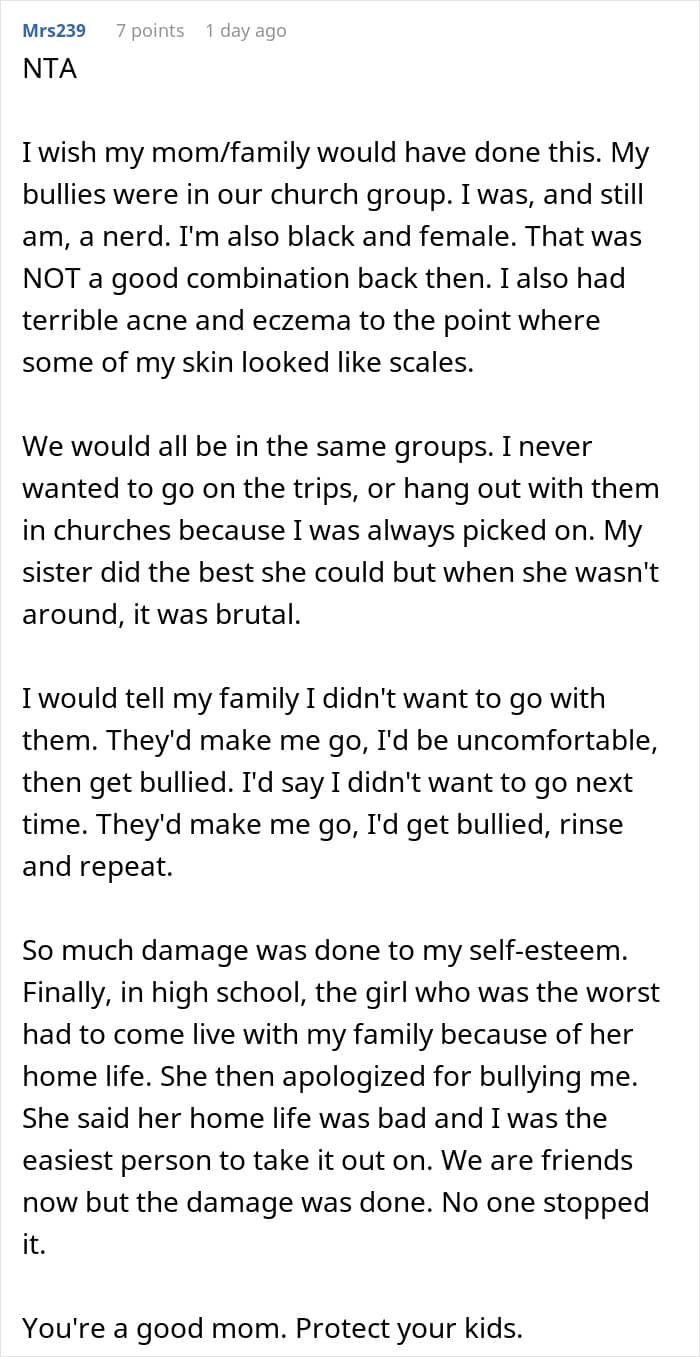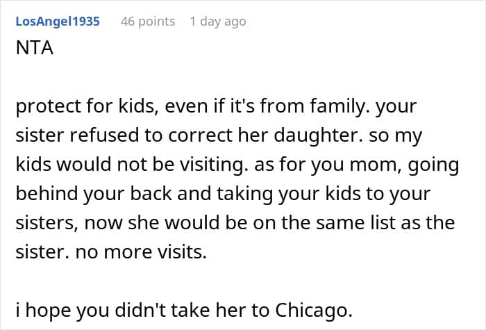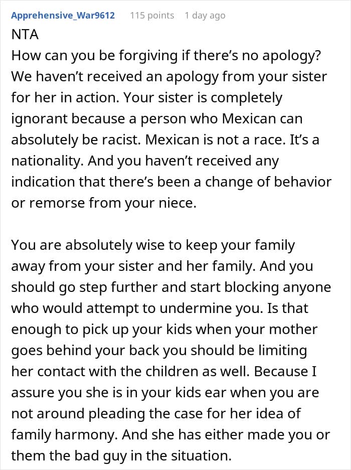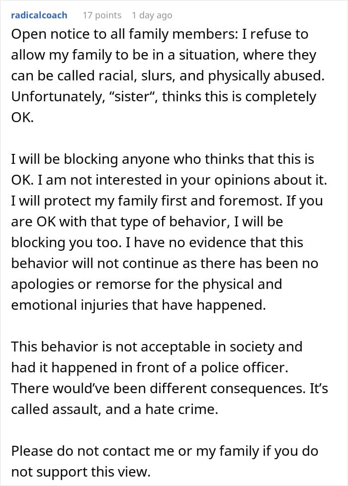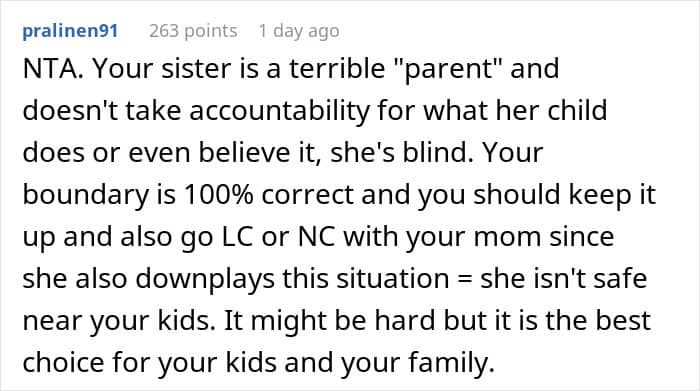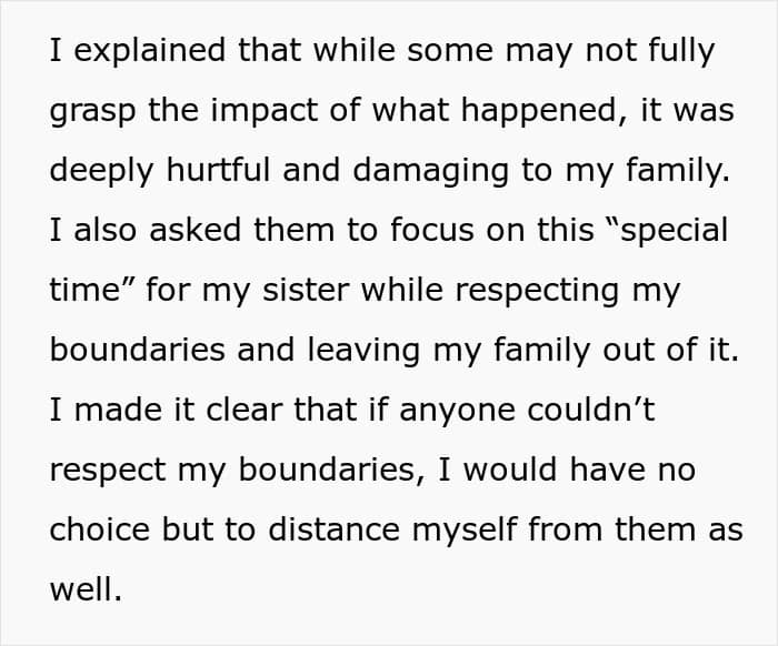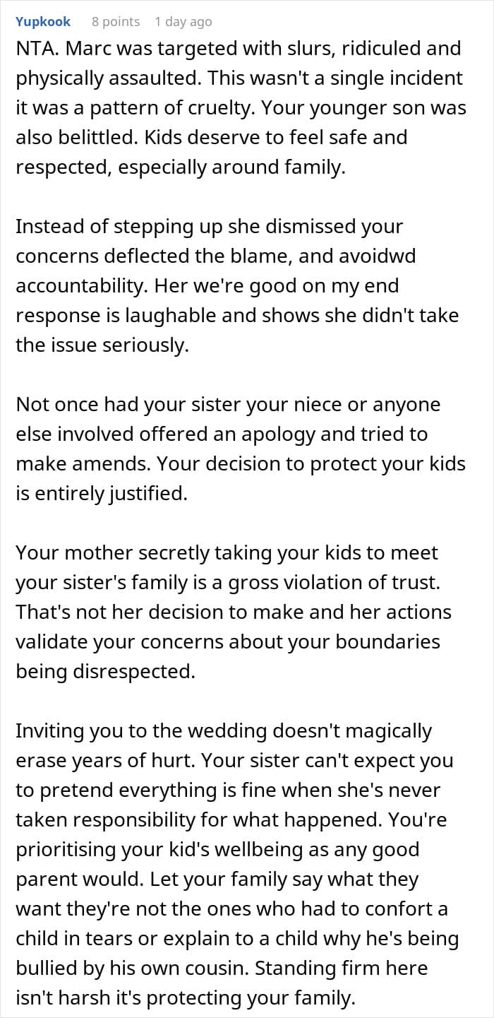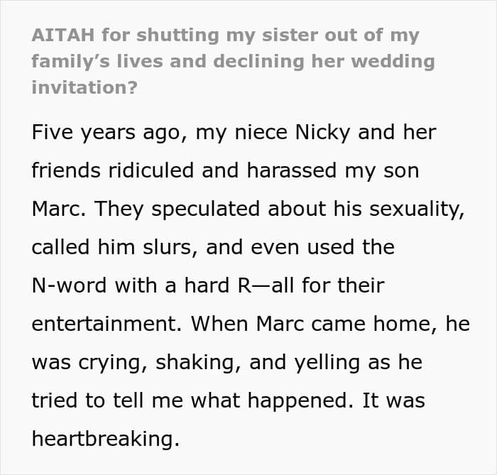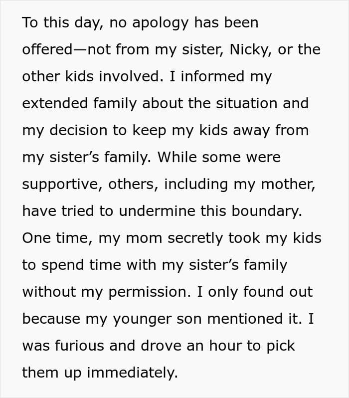 You can’t choose your family, but you have a say in your relationships with them. A few days ago, Reddit user Fokaifemme shared her story on r/AITAH, detailing the fallout with her sister. For a long time, her sons had been bullied and harassed by their cousin and her friends in a deeply hurtful way. Despite the mom’s efforts to address the issue, her sibling met her with dismissal, and there was no resolution. Faced with a lack of accountability, the woman made the difficult decision to set firm boundaries—sparking years of tension that have recently reached a boiling point. So, she asked the internet to help her make sense of the whole ordeal.