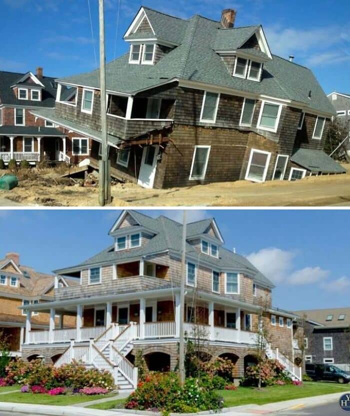 Before & After ~ Recovering from Superstorm Sandy. Before: Patrick Lynnett, after: Liz Roll. Sandy made landfall as an enormous post-tropical cyclone near Brigantine, NJ, in 2012, bringing a massive storm surge along the coast, damaging some 346,000 homes in the state. This historic beach house was swept from its foundation by the surge, sustaining significant damage but remaining largely intact. It was elevated onto a higher foundation that will allow future flood waters to flow under the house, adapting to the reality of climate change and increasing likelihood of future coastal flooding. Coastal communities worldwide are studying how to accommodate rising sea levels and intensifying storms. Many of these communities are grappling with the challenges of preserving historic buildings under these conditions. Elevating buildings is one approach; restoring dunes and building sea walls are among the other approaches to slowing the impact. The least desirable option is to abandon our heritage and allow the sea to claim it. Preservation fights climate change. The embodied energy contained within historic buildings saves carbon compared to building new buildings to replace them. According to the EPA, it takes about 65 years for an energy-efficient new building to save the amount of energy lost in demolishing an existing building. The inherent sustainability of historic houses and improving energy efficiency are addressed in “Restoring Your Historic House, The Comprehensive Guide for Homeowners.” Signed and personalized copies of the award-winning and bestselling 720-page hardcover book are available from the author in our online shop at YourHistoricHouse.com/shop/. © Scott T. Hanson 2024