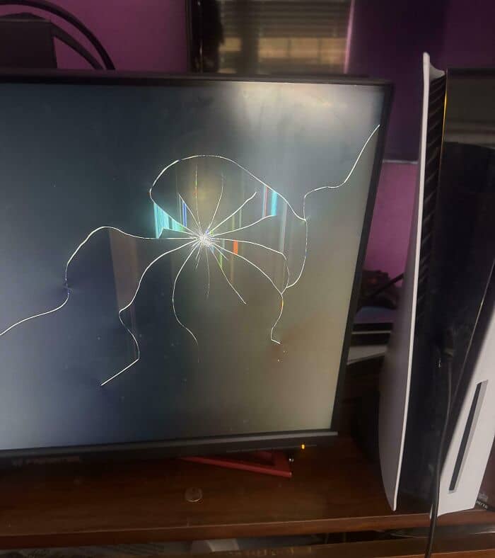 My wife called while I was at work and said it was a little “scratch” on the monitor… After further investigation, I found out my 7-year-old got annoyed at Roblox and threw the controller at it. It really ticks me off how my wife always sugarcoats everything he does. Like I can’t even discipline him without her getting in the middle of it or shielding him like I’m a total abusive monster… This is crazy because I don’t even spank my kids; all it takes is a stern voice, and they start crying.