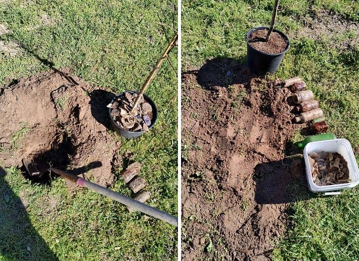 While trying to plant a cherry tree in my yard, I kept hitting hard things about 4 in below the surface. I was really hoping there’d be some large cool stones I could add to my landscaping, but nope. It was just bottles and bottles and bottles and tons more broken glass bottles. After all this digging through and separating pieces of broken glass from my lovely, rich soil and keeping my 3-year-old away because he wanted to help pick up the glass, I had fill it back in because I dug too close to the house.
